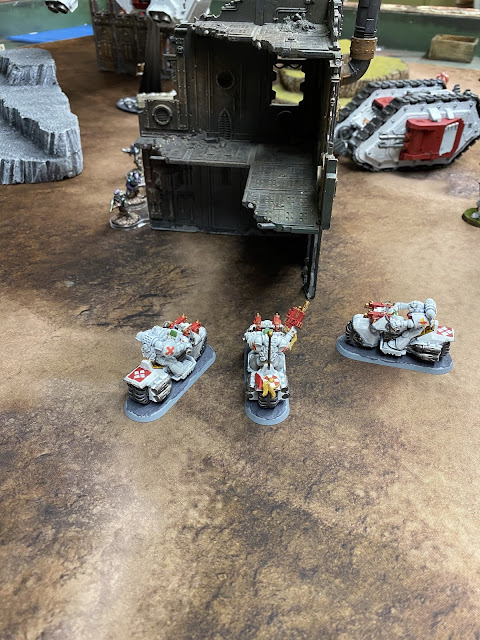 In my first shooting phase, I used the stormraven, land raider, and predator, to cripple all three of his basilisks, bringing two down to their final tier on the damage table, and the third to the middle tier. The missiles on the gunship and the lascannons on the two tanks took care of that. The dakka on the gunship then took out some of the mortar teams and bikers in that area, as well. So far so good!